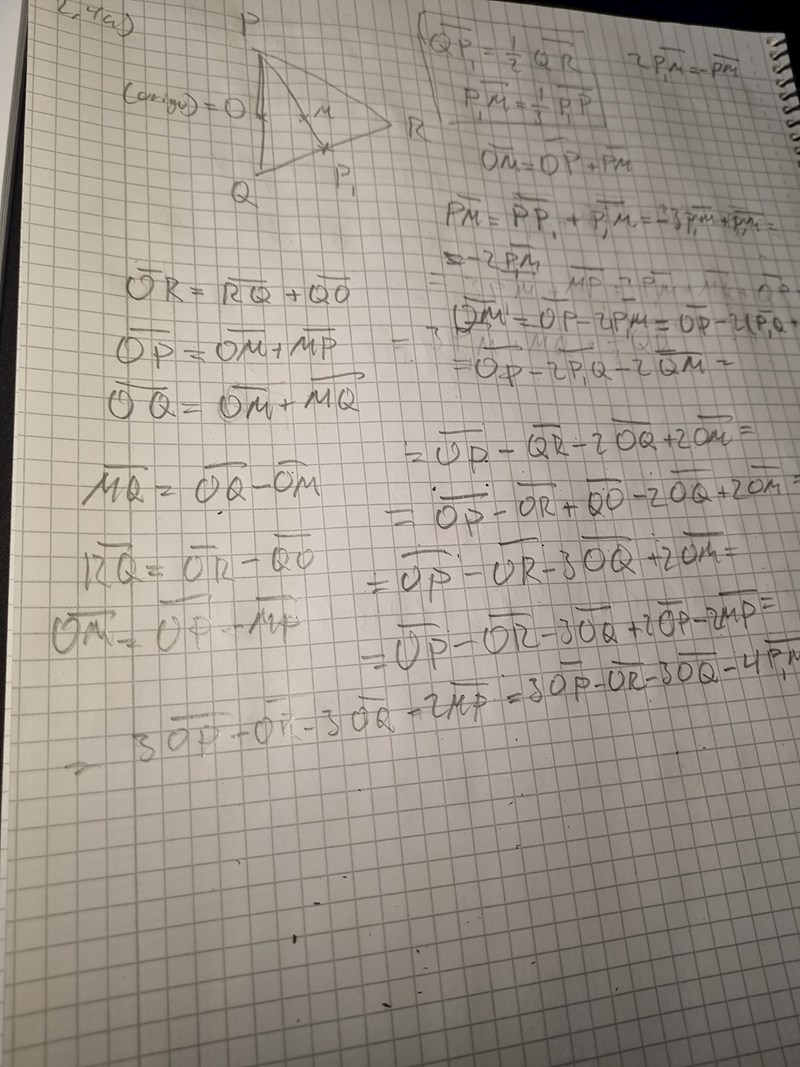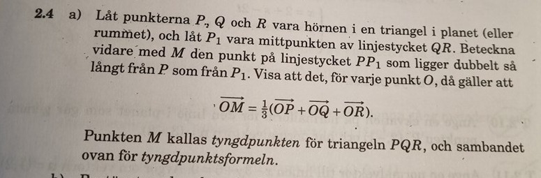 Om du inte kommer vidare med dina anteckningar kan du pröva att göra så också. Uttryck sträckan OM på tre vis mha. omvägar via P, via Q respektive via R. Försök få dem på en form så att du har sträckor som man kvitta mot varandra. Addera dessa tre definierade vägar från O till M och dividera med 3.