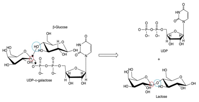 Bilden nedan visar schematiskt hur reaktionen i laktossyntas sker, där en hydroxigrupp på glukos (blå cirkeln till vänster) fås att skapa en ny glykosidbindning till kol 1 i galaktos (röd cirkel till vänster), samtidigt som UDP delen lämnar. Efter reaktionen är hydroxigruppen en del av bindningen mellan monosackariderna (cirklarna till höger efter reaktionen visar var hydroxigruppen och kolet finns efter att bindningen bildats).