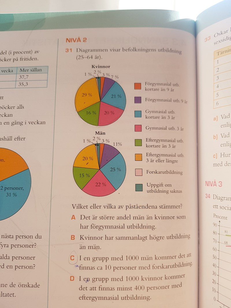 shkan skrev:Uppgift C säger att en grupp med 1000 män (ta hänsyn cirkeldiagrammet för män) kommer ha ca 10 personer med forskarutbildning.