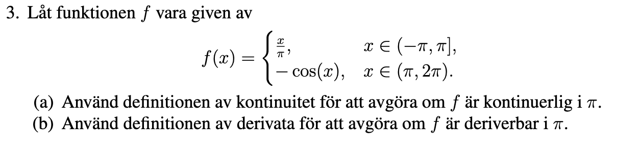 Jag har svårt att förstå hur jag ska beräkna med derivatans definition på b. Förstår att jag behöver beräkna både höger- och vänsterderivata när h--> 0 i och med att f(x) är styckvis definierad. Samt att dessa måste vara lika för att derivatan ska existera i punken pi.
