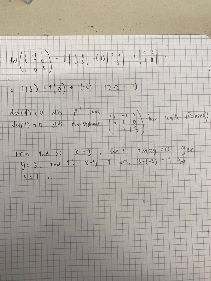 Om man spolar till 19:02 så säger han att om determinanten för en matris är skild ifrån 0 så innebär det att om man betraktar matrisen som ett linjärt ekvationssystem så har den unik lösning... men varför har inte den bifogade matrisen unik lösning? (den har ingen lösning)....