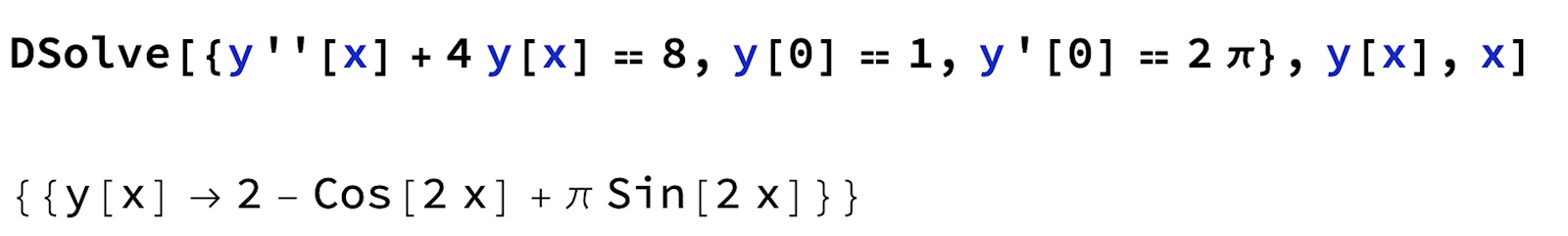 Jag ska lösa differentialekvationen: y´´+ 4y = 8 med begynnelsevillkoren: y(0) = 1 och y'(0) = 2 pi