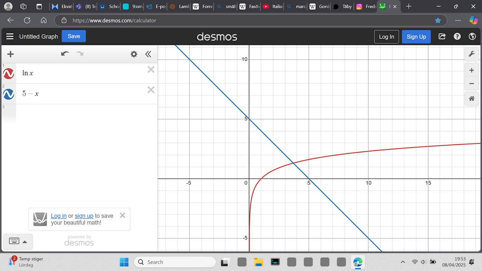 ln x = 5 - x