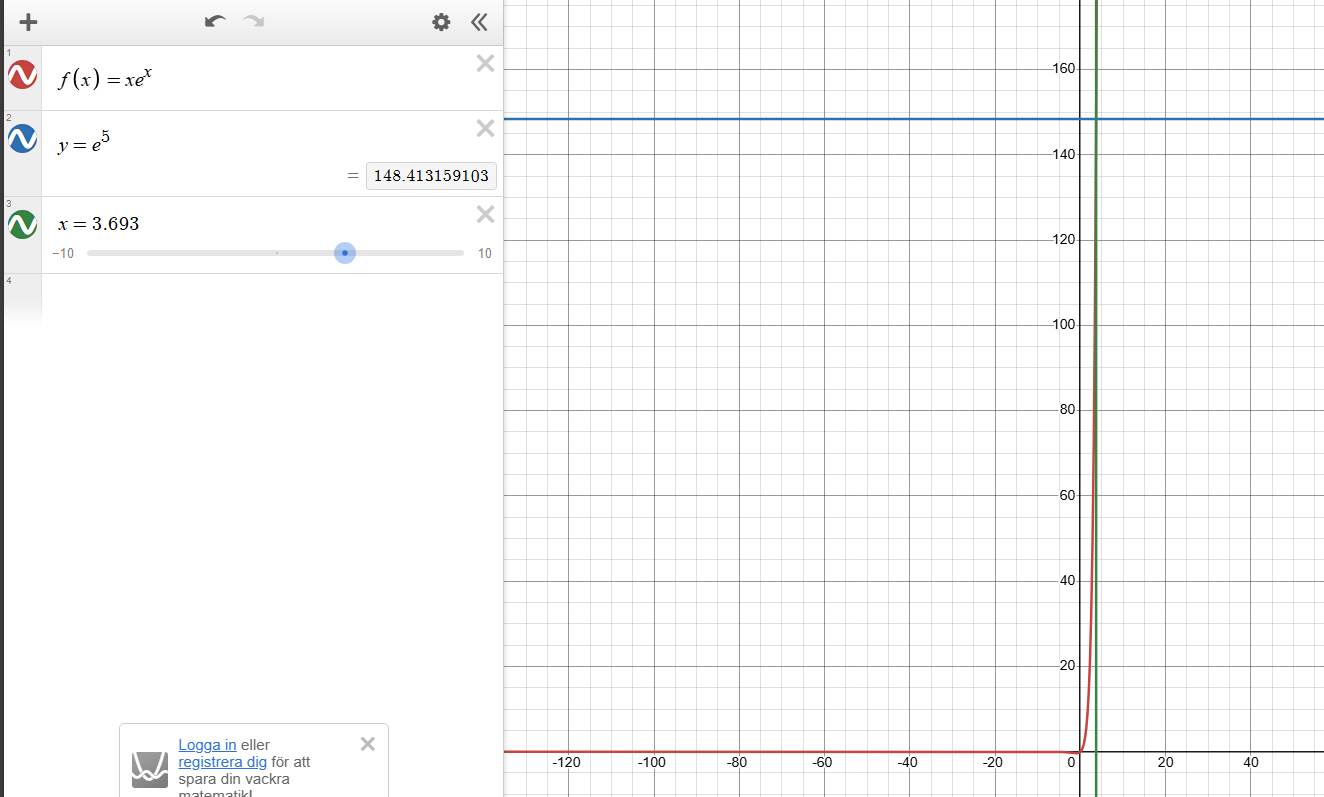 Som du ser så beskriver intersektionen mellan röda linjen och blå linjen då lösningen till ekvationen. Och som Lasse Vegas sa, så blir svaret ungefär att x = 3.693. Ett mer exakt definition av värdet däremot finns bara genom att använda sig av Lambert W funktionen dock.