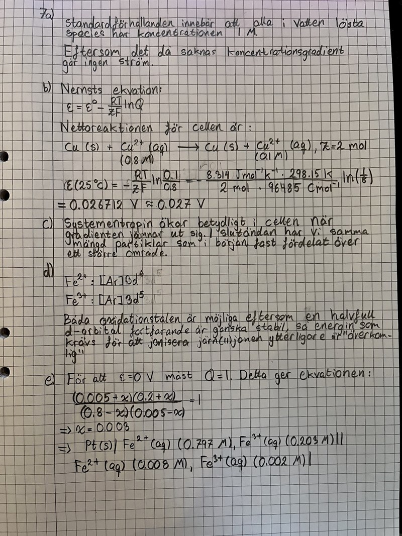 Jag har svarat på papper den här gången så en bild bifogas nedan. Jag undrar om jag har tänkt rätt eller om det har blivit något fel någonstans (på sista frågan förutsätter jag att båda halvcellerna har lika stor volym):