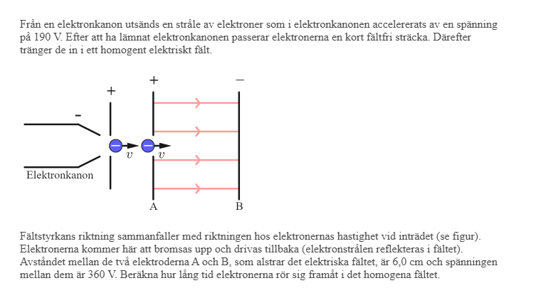 Jag vill använda mig av sambandet: v = v(start) + a*t för att beräkna tiden. Jag vet inte hur sluthastigheten ska beräknas. Vad gäller accelerationen vet jag att den påverkas av en kraft (riktad åt vänster) som är lika med = E * Q. Om F= E*Q och F = m*a kan accelerationen beräknas. Jag vet inte hur jag ska använda informationen om det första fältet.
