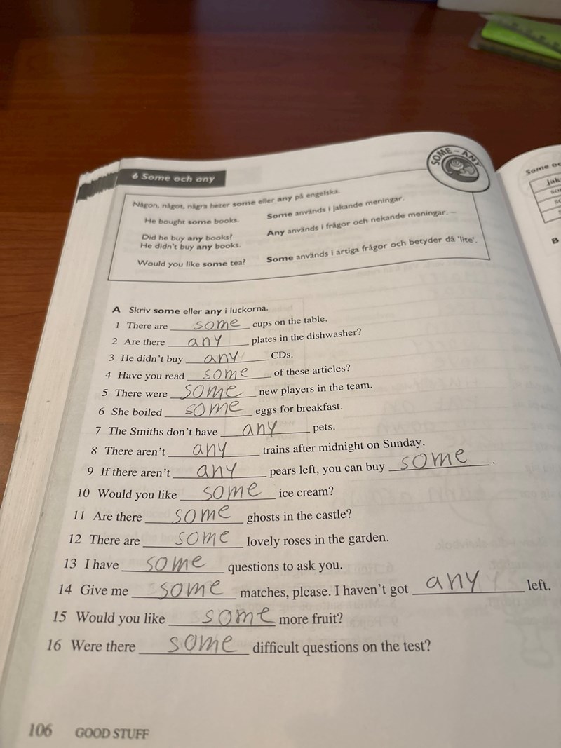 Det ser rätt bra ut. För frågorna ska det ibland vara any där du har skrivit some. 10 och 15 är artiga frågor och de är rätt.