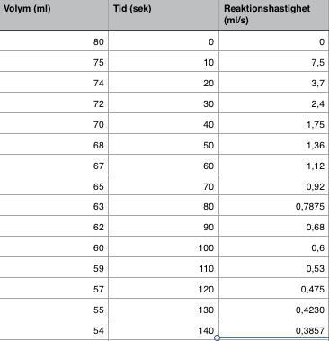 EDIT: Jag räknade ut reaktionshastigheten (ml/s) som det stod på tavlan och la in värdena i en tabell: