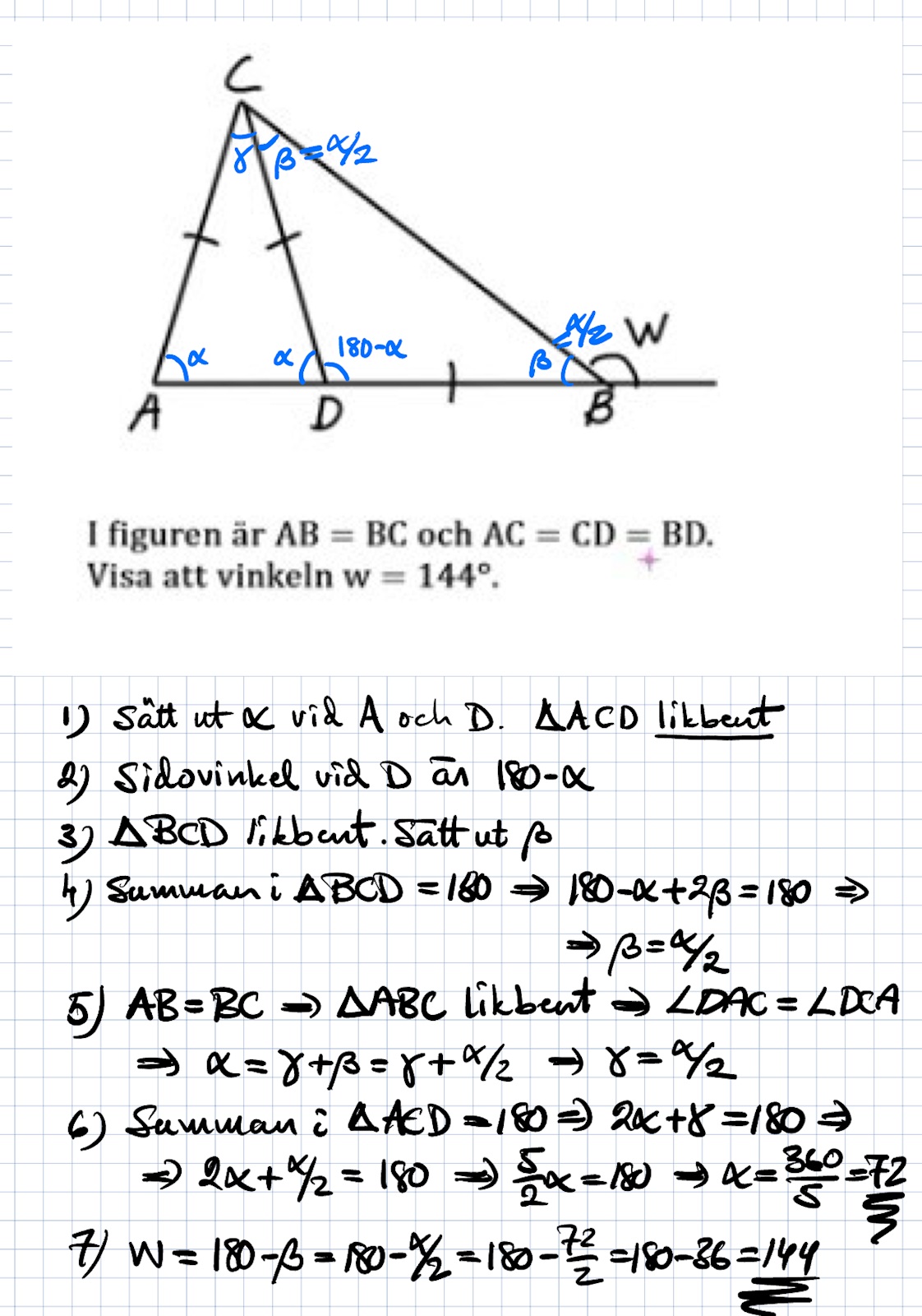 Louis skrev:Sådana här uppgifter kan man alltid lösa på olika sätt beroende på vilken väg man tar genom figuren.