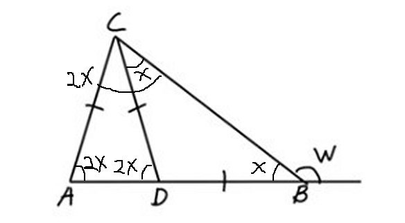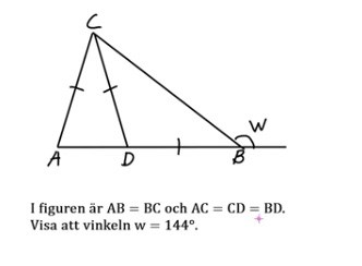 Jag har markerat en vinkel x som du lätt kan räkna ut. Eftersom CD och BD är lika, är BCD likbent. Det ger dig en annan vinkel gratis som jag markerat.