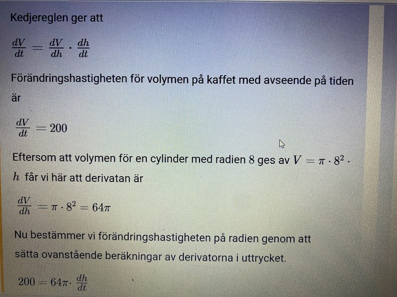 Hej! Jag förstår inte hur man får dV/dh till pi64 och inte pi64h?? Volymen av en cylinder är ju V=pir^2 h