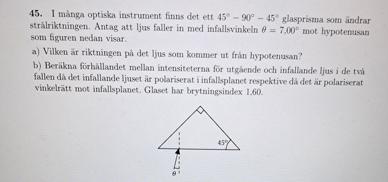 Pieter Kuiper skrev:Uppgiften handlar en en typ av prism som används i kikare, bilden visar endast principen. Så länge du inte har fått strålgången klart för dig är det ingen mening med att slå in fresnelformler för reflekterade intensiteter in i någon miniräknare.
