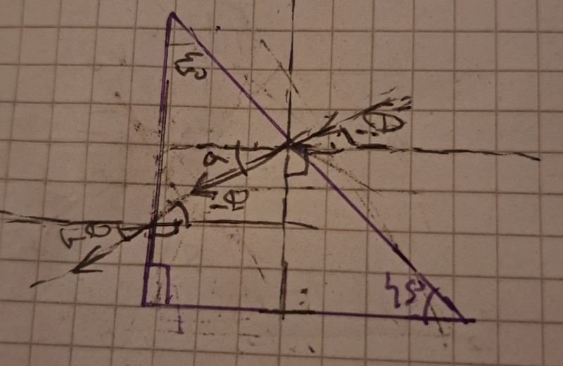 Okej så strålen rör sig på det här sättet som du skissade dvs den kommer in i prismat från något medium och cirkulerar i prismat för att sen hitta sin väg ut?