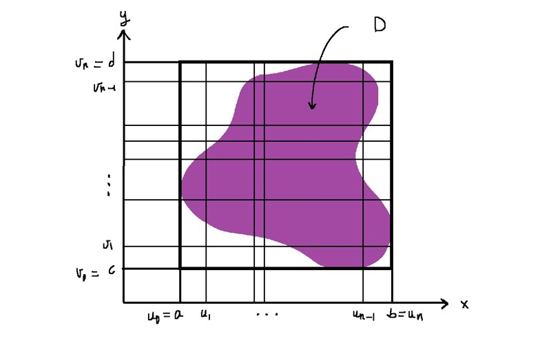 Given the function and the region , the sum is a real function of and . When we replace and by positive infinitesimals and , we obtain the infinite double Riemann sum