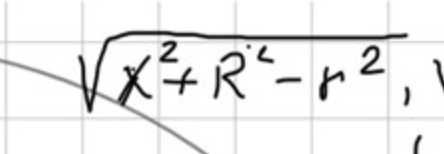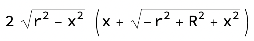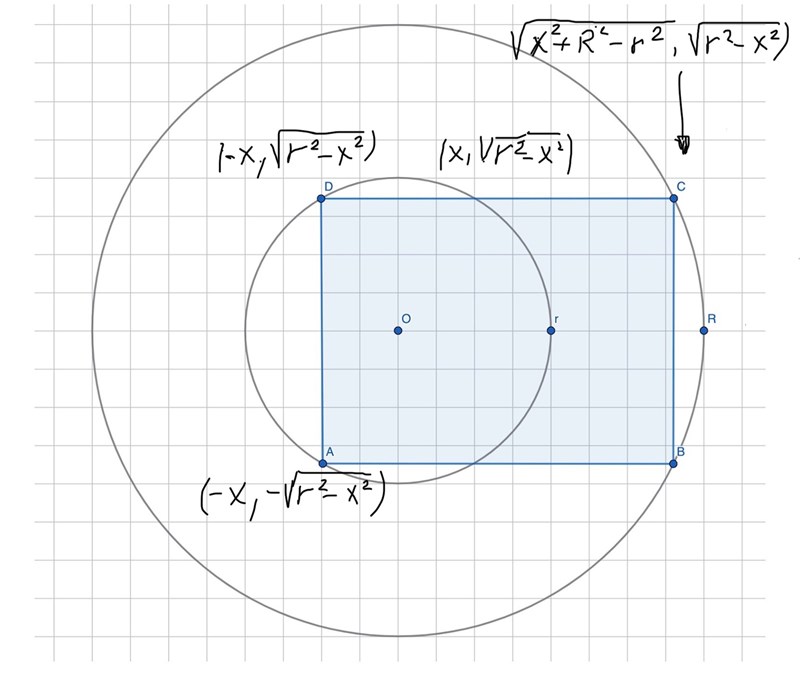 Hörnet C’s x-koordinat är √(R2 -y2) = √(R2-(r2-x2)) = √(x2+R2-r2)). (Orkar inte justera kvadratpotenserna.)