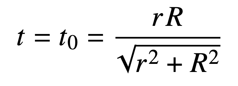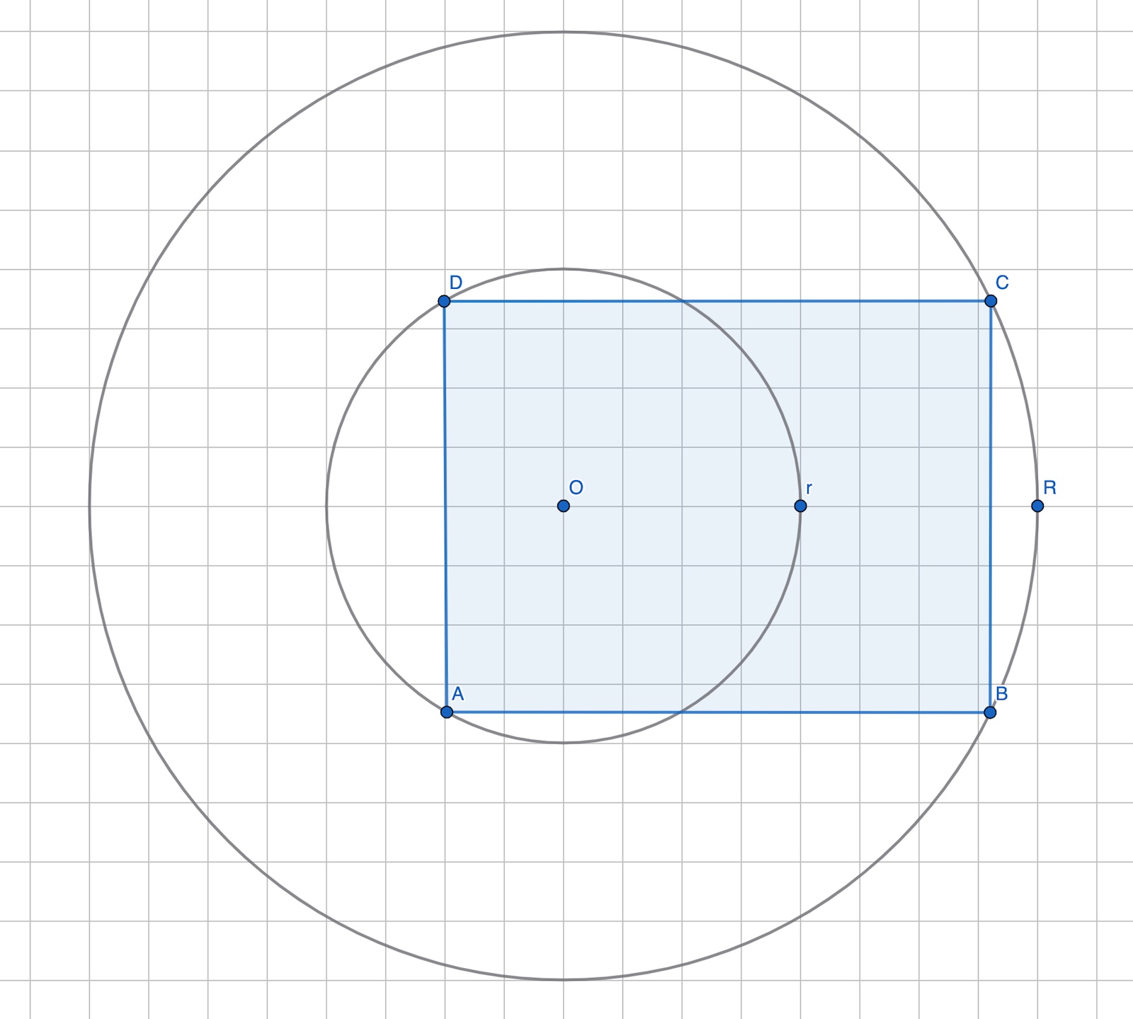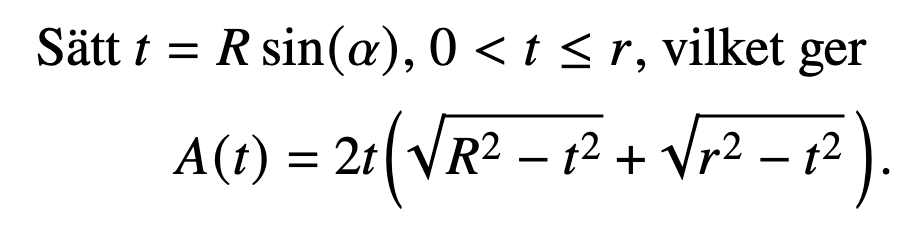 Deriverar man areafunktionen A(x) ovan och söker nollställe för A’(x) får man att maximum inträffar för x = r2/√(r2+R2).