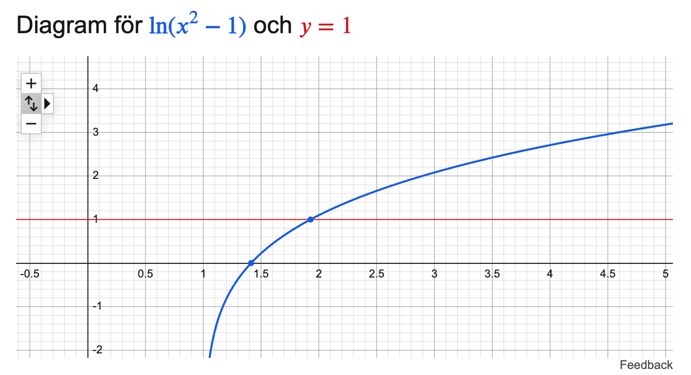 Förstår, så eftersom C alternativet inkluderar då nämnaren är noll så går inte det alternativet. Men detta behöver man alltid kontrollera då eller? För jag tänker att det också finns möjligheter då det kanske hade funnits alternativ som gett ok för båda ln och nämnaren angående def. mängd. Hur som helst räknade jag fram x då nämnaren ger noll: +-sqrt(e+1) som mycket riktigt är större än sqrt(2).