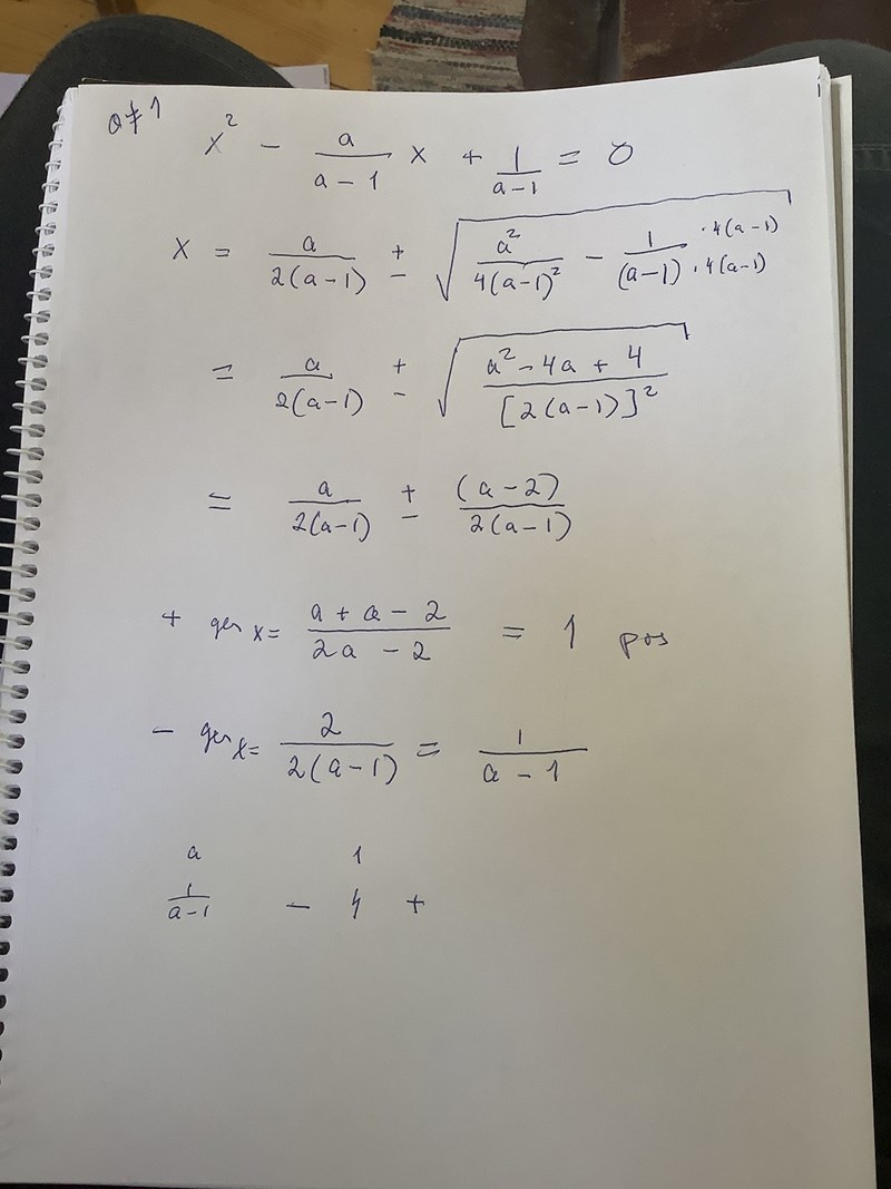 Jag löste med pq-formeln och satte att den lägre av de två lösningarna skulle vara större än noll. Förenklar och får a/(2(a-1)). Då ges med tecken tabell att positiva lösningar ges då a>1. Minsta lösning blir 2. Men de säger 1 i facit, vilket inte borde gå då vi har a-1 i nämnaren, så då blir det odefinierat.