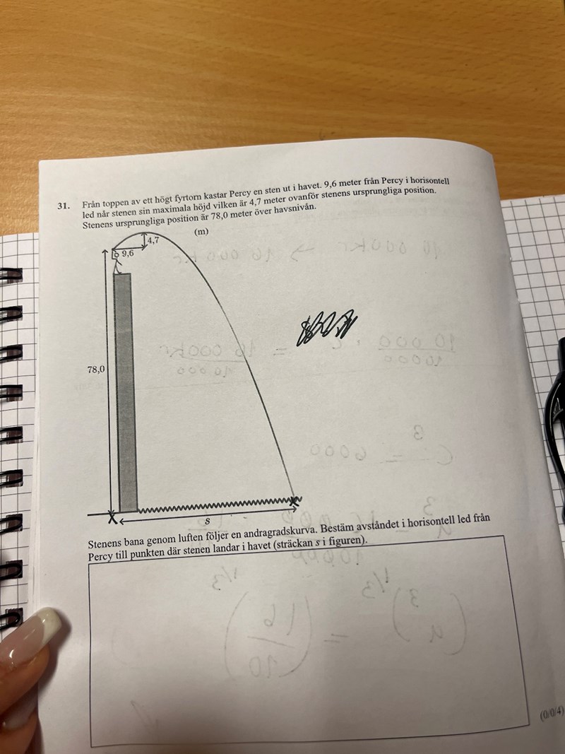 Tips: Du vet att stenens bana är en andragradskurva (parabel). Försök att utnyttja det. Börja med att lägga in ett koordinatsystem på lämpligt sätt.