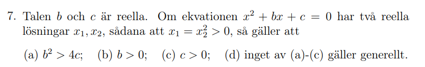 Jag vet att det är reella lösningar och eftersom vi fått att x1=x2 i kvadrat. Så måste x1 vara positiv och x2 vara något annat än vad x1 är. Dvs diskriminanten är endast större än noll. Då ges b^2-4c>0 alltså b^2>4c. Då svarar jag a. Men det är d som är rätt. Hur kan det bli så?