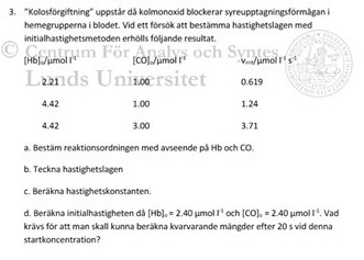 Hur kommer man fram till ordningen på en reaktion? Vad innebär ordning? Förstår verkligen inte sambandet och hur man ska komma fram till det. Spontant bör det vara logiskt att jämföra konc. Hb när CO är konstant med v. Då får jag en potens upphöjt till 1. Detta bör väl ge mig första ordningen? Svaret på är tydligen andra...