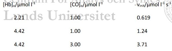 Här ser vi att om vi sätter ursprungskoncentrationen kolmonoxid konstant och dubblerar koncentrationen hemoglobin, får vi en dubblering i hastigheten. Därför måste .