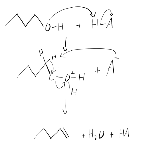 Hej! Har en fråga om en reaktionsmekanism där en alkohol blir en alken med hjälp av en syra genom E2! Har för mig att E2 sker genom ett enda reaktionssteg, men jag kan inte riktigt lyckas få slutprodukten med bara ett, behöver typ ett steg där alkoholen aktiveras och sedan ett till där H2O spjälkas av, skulle detta då räknas som att eliminationsreaktionen gått genom 2 reaktionssteg och då vara fel?
