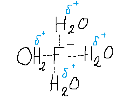Det betyder att lösningsmedlet skapar vätebindningar med nukleofilen. I vårt fall med flouridjonen kommer t.ex. vattenmolekylerna lägga sig runt den och skapa vätebindningar: