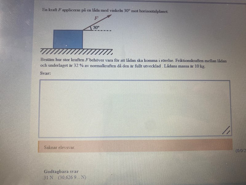 Ytterligare tips: du minskar normalkraften genom den vertikala komposanten hos dragkraften.