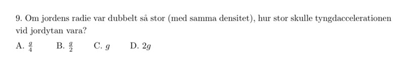 Hej, följande uppgift ska man beräkna hur många ggr större/mindre tyngdaccelerationen blir när jordens radie fördubblas. Jag löser uppgiften på ett rimligt sätt och får fram att tyngdaccelerationen halveras. Enligt svaret är B fel, och korrekta svaret är D. 2g, fattar ej varför.