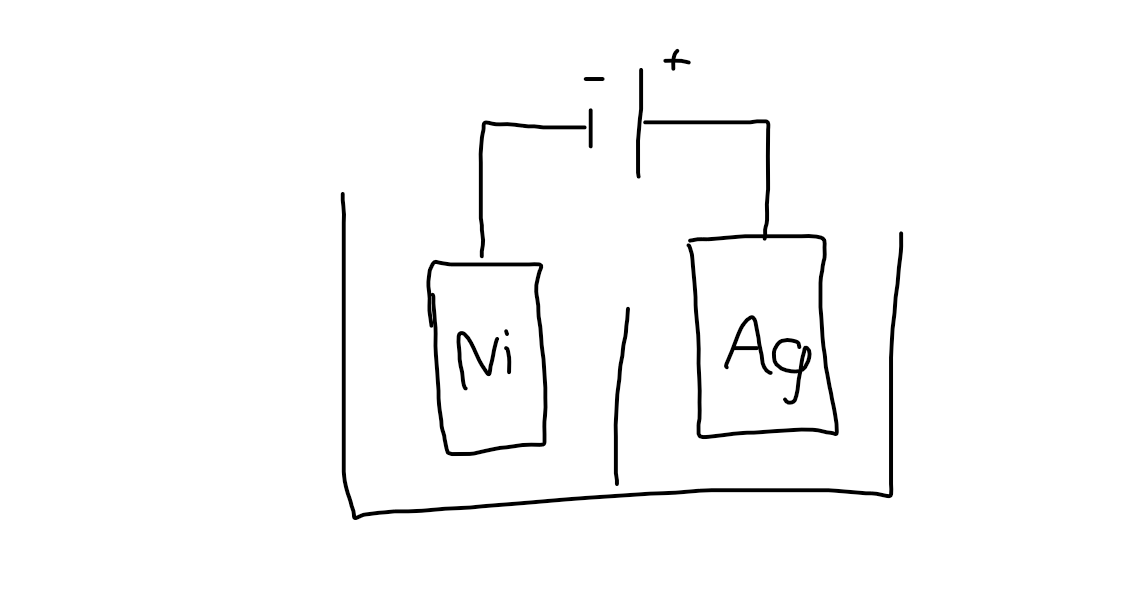 Jag tror jag tänkte lite fel kring åt vilket håll elektronerna måste flöda i vår elektrolys här. Visst skulle man behöva koppla upp spänningskällan så här? Det vill säga vi tvångsoxiderar silvret genom att pumpa elektroner bort från silverelektroden, inte till silverelektroden (och vi tvångsreducerar också nickel(II)joner).