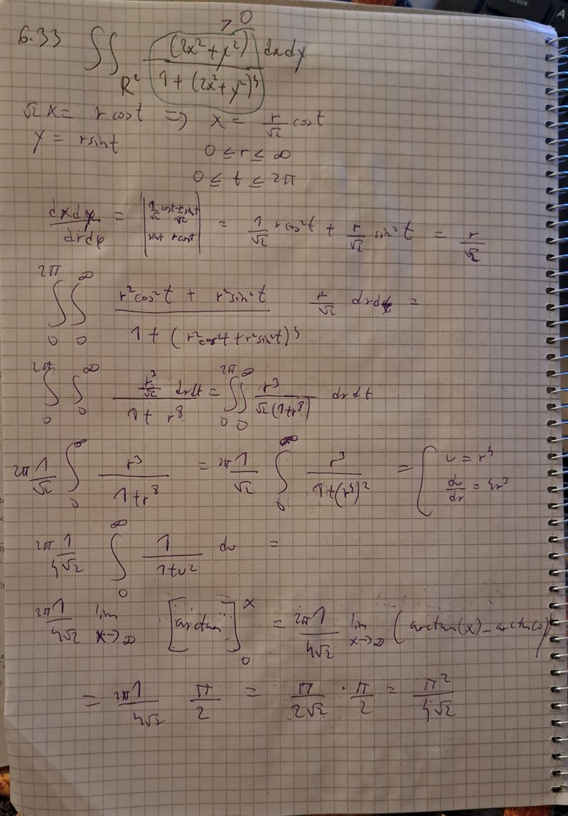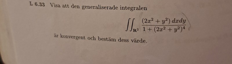 Eftersom täljaren är positivit och likaså nämnaren så vet jag inte hur det blir med gränserna samt om vi kan byta till polära koordinater och tänka att r går mellan 0 till inf och vinkeln går mellan 0 till 2pi. Så långt kom jag :