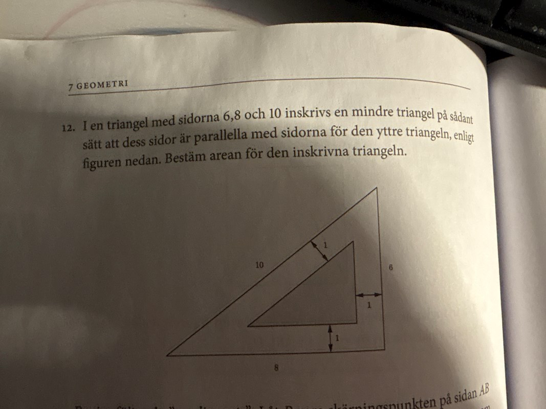 Vi har då att avståndet mellan de två hypotenusorna är och den mindre triangeln utgör en topptriangel på den stora, toppen på 90 grader. Jag har på känn att detta kan leda till att man kan få reda på någon av den mindre triangelns sidor som man därmed kan få ut arean på.