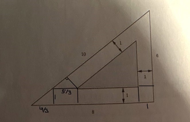 Den inskrivna triangelns längre katet är 8 - 4/3 - 5/3 - 1 = 4,