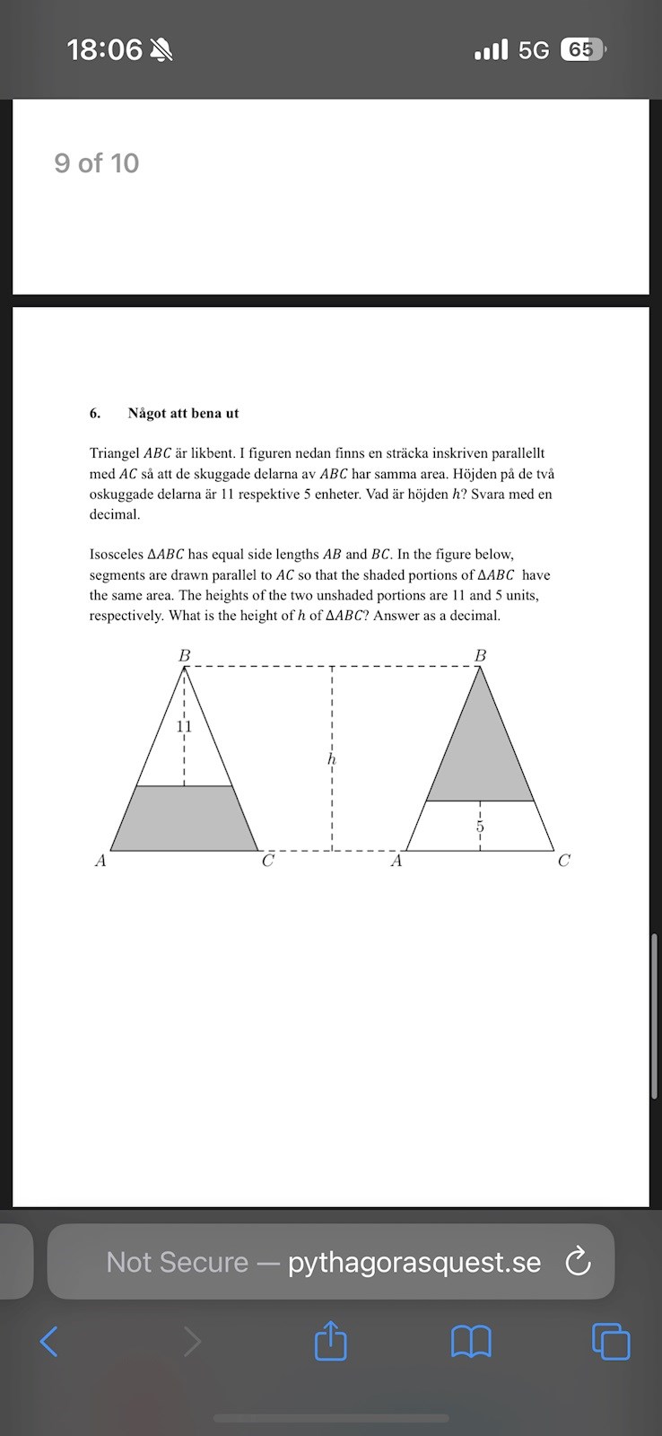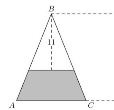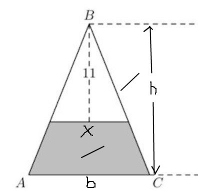 Du skulle kunna börja med att ta reda på vad höjden av de skuggade areorna är. I triangeln till vänster så har den skuggade arean höjden (h - 11), och i triangeln till höger har den skuggade arean höjden (h - 5).