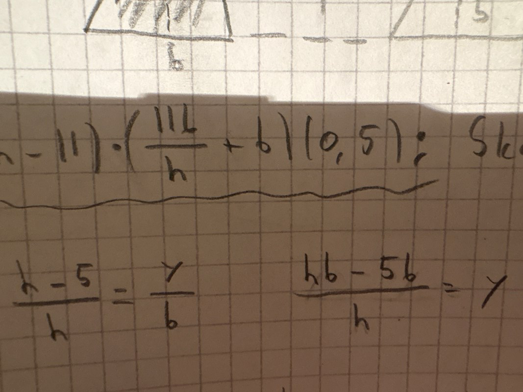 b(h-5)/h är basen i den grå triangeln. Behåll b utanför parentesen för den faktorn kommer försvinna när du ställer upp ekvationen.