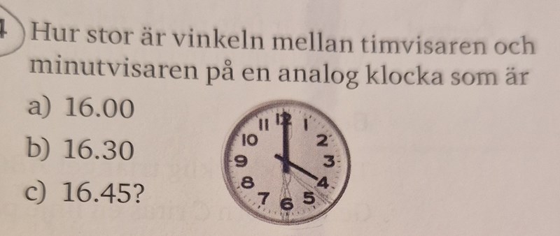 Det är 5 min mellan varje siffra och 60 min på ett helt varv. 60/5=12 dvs 12 steg på ett helt varv. 360 grader är ett helt varv och 360/12=30 dvs 30 grader mellan varje siffra. Du har 4 steg mellan visarna och därmed 4*30=120 grader när klockan är 1600 .