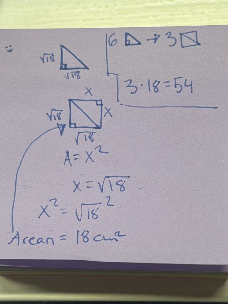 Ett tips är att tänka att det är 6 trianglar. Sätter man ihop dem 2 och 2 så får du ju 3 kvadrater, om du förstår vad jag menar, tänk att du har en kvadrat och så drar du diagonalen på den. Där har du 2 av de 6 trianglarna.