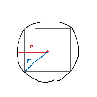 Eftersom avståndet från mittpunkten till kanten av cirkeln är lika stort överallt (det är lite definitionen av en cirkel) kan vi rita ut att avståndet från mittpunkten av kvadraten till en kant, är lika stort som cirkelns radie: