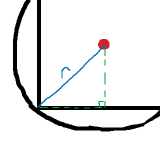 Om vi zoomar in lite grann på just den biten av bilden, kan vi rita lite noggrannare. Radien bildar hypotenusan i en rätvinklig triangel: