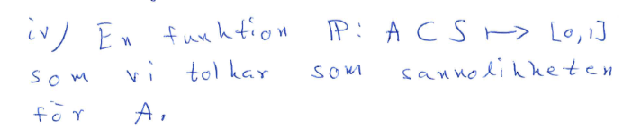 Ja. Funktionen borde väl vara , där . Alltså att funktionen tar en delmängd av utfallsrummet och spottar ut ett tal mellan 0 och 1.