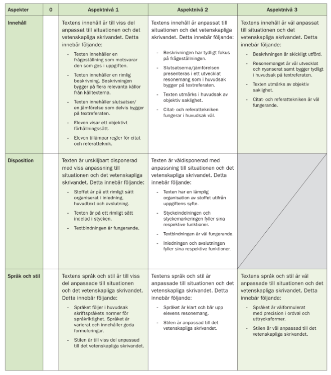 Det är ett nytt system för hur rättning görs på nationella provet. Det är nu "Aspektnivåer" och inte E C A. Varje aspektnivå är värt en viss poäng så får man Aspektnivå 3 på ett krav inuti de tre Aspekter (innehåll, disposition och språk) får man mer poäng. Ens poäng räknas sedan ihop och får man inom ett visst intervall av poäng får man ett visst betyg. E är 13-20 poäng osv.