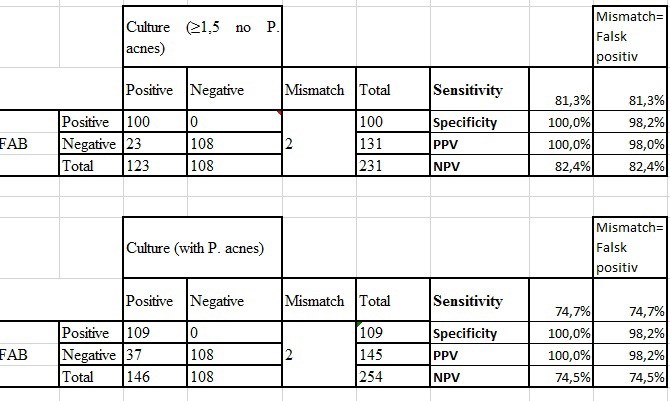 Min data är på nominal skala. "Culture" är rutinmetoden och "FAB" är min metod. "Mismatch" = annan typ av falsk positiv då jag hittat nåt som inte bör finnas i provet MEN jag har aldrig hittat nåt i prov som ska vara helt negativa, därav uppdelningen.