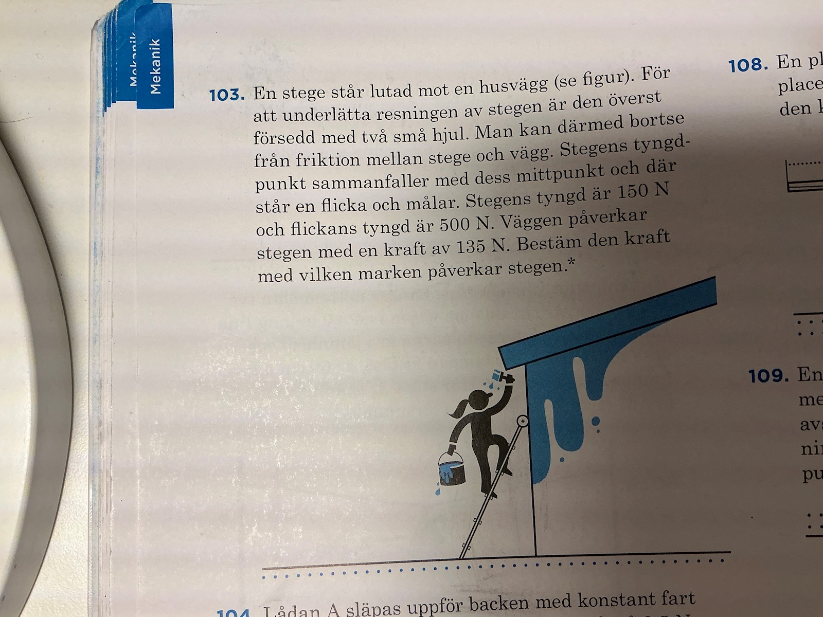 Ska inte kraften M vara riktad åt andra hållet? Då blir det väl en kraft från stege på mark och inte mark på stege?