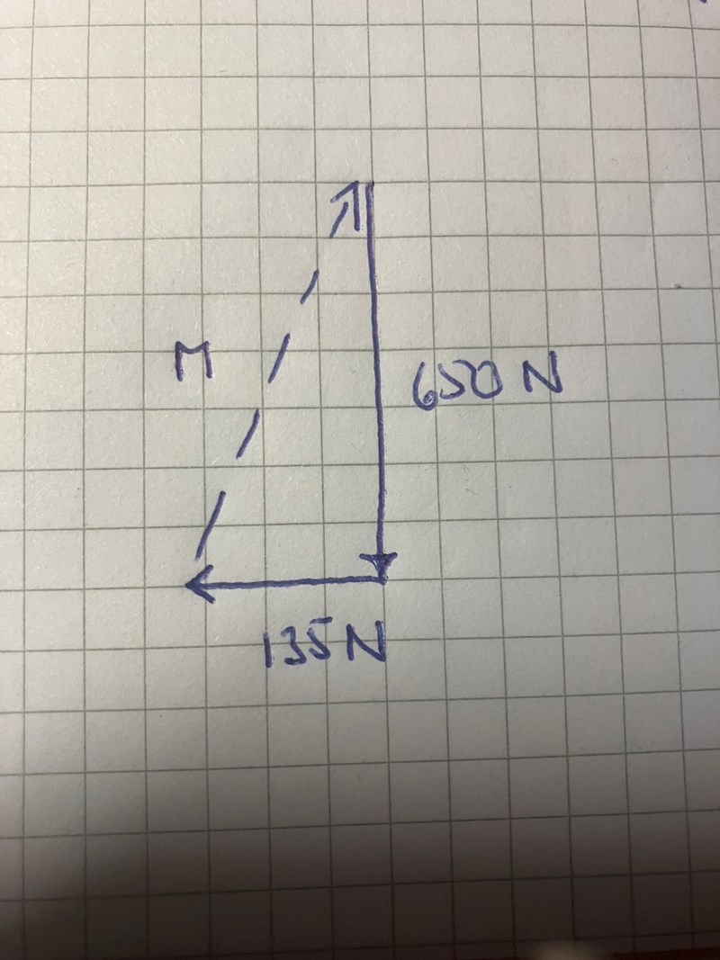 Systemet flicka och stege påverkas av tre krafter /vektorer som måste bilda en en sluten triangel för jämvikt, se figur. En kraft är tyngdkraften 650 N, en är kraften från väggen 135 N, och en är kraften från marken, M. Så M=