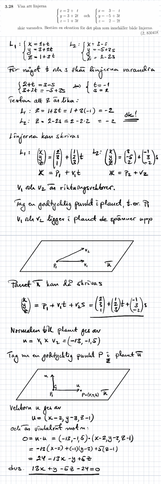 Sedan är det lätt att ställa upp parameterformen för planet. Tag någon punkt i planet och addera de 2 vektorer (riktningsvekt. för de 2 linjerna) till punkten.