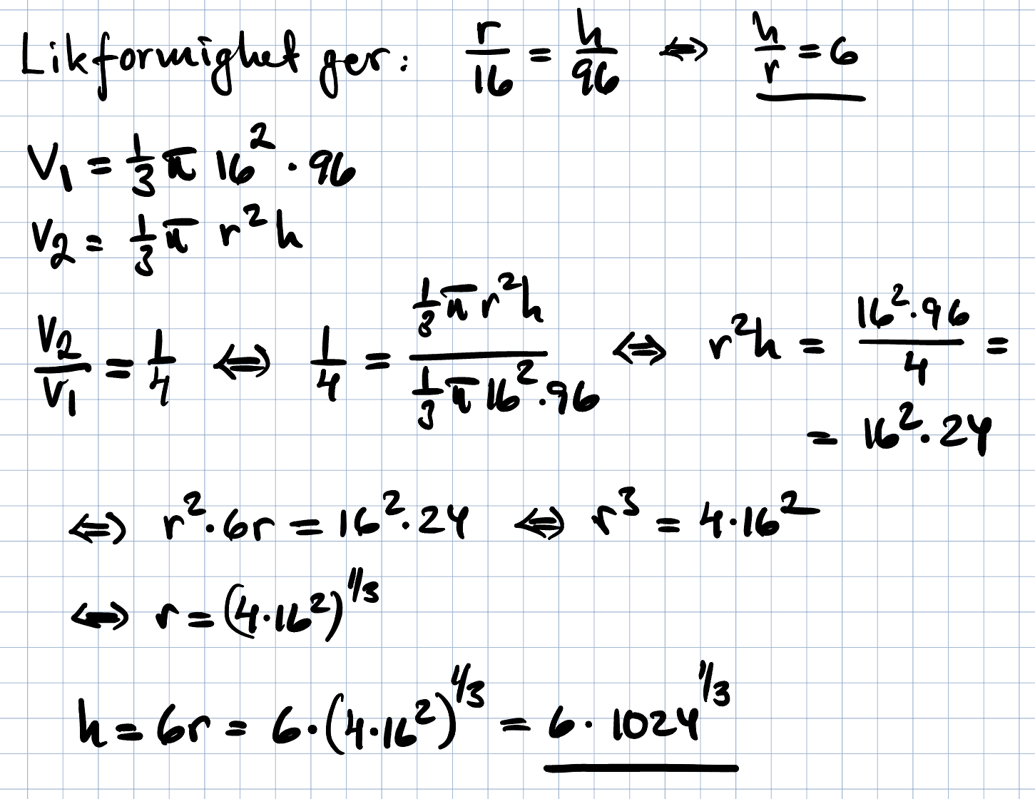 Iridiumjon skrev:Lösningarna utnyttjar ju samma principer. Man måste veta förhållandet mellan höjden och radien och sedan veta formeln för en kons volym. Bra uppgift tycker jag.