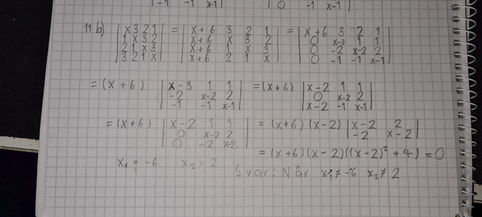 Jag försöker då lösa när determinanten är skiljd från noll, men fastnar här: