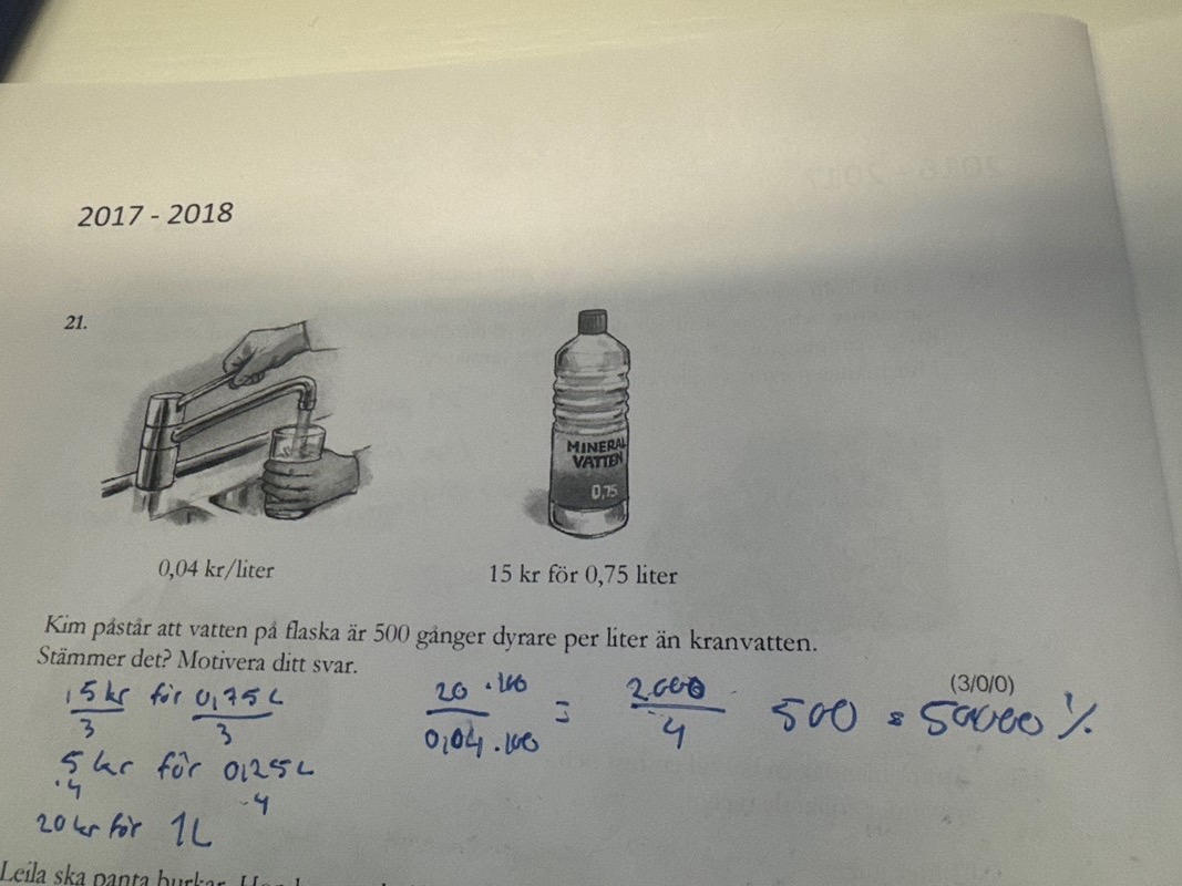 Man behöver inte räkna om till procent och uträkningen 200/4=500 visar att vatten på flaska är 500 gånger dyrare än kranvatten. I Sverige är det en rätt hög kvalitet på kranvatten och man kan dricka det utan att koka upp det först, men i några länder måste man köpa vatten på flaska, eller snarare på en dunk, om man vill dricka det.