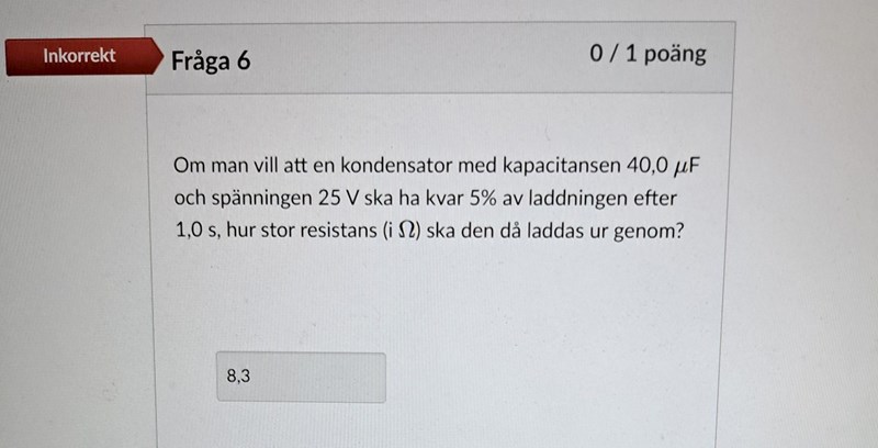 Ingen aning eftersom man slumpar frågor om man får fel på en fråga, sen ska man avrunda också. Tror du att 8340 ohm hade varit rätt svar?